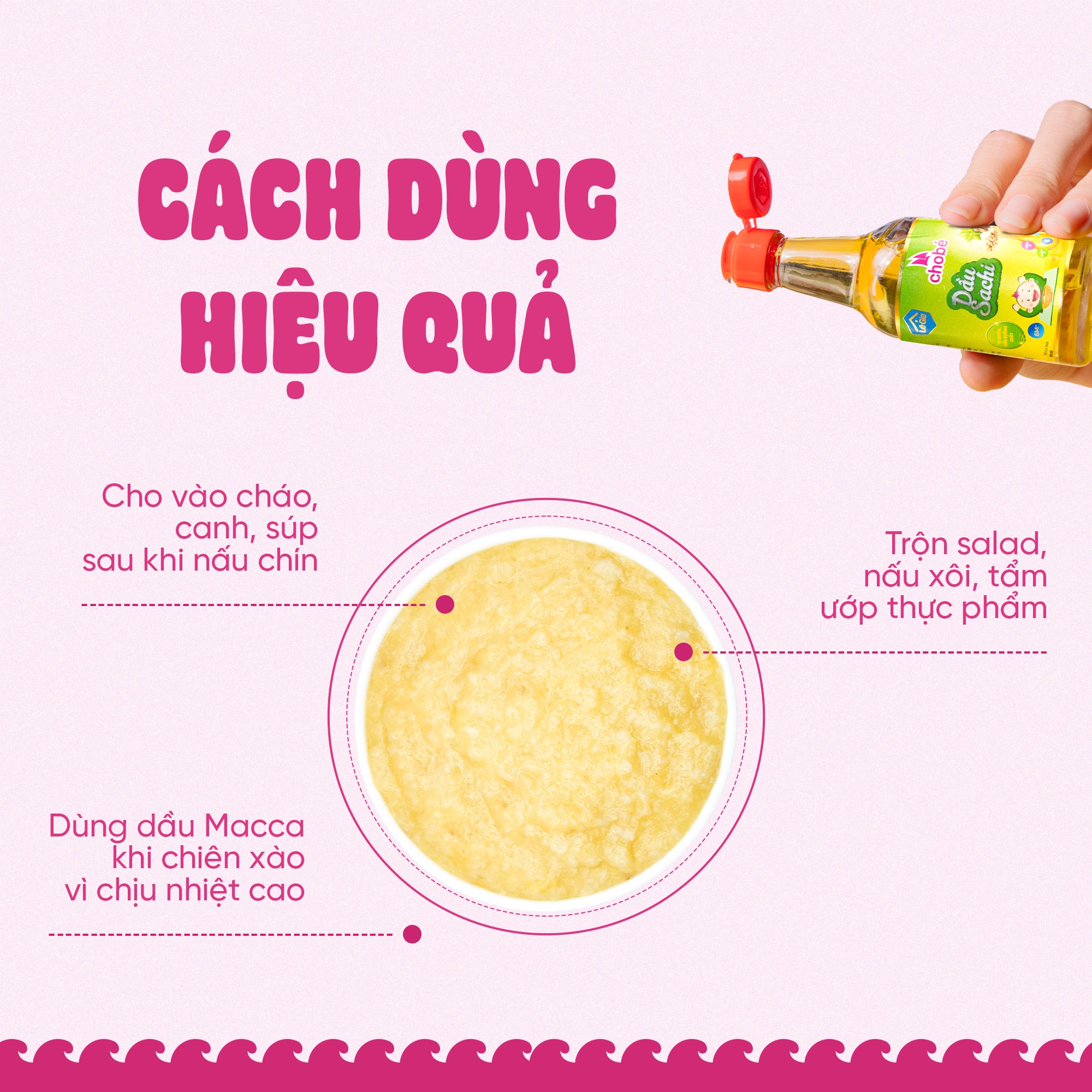 Cách dùng dầu Sachi cho bé ăn dặm rất đơn giản nhưng mang lại lợi ích vượt trội cho sự phát triển trí não và sức khỏe của trẻ nhỏ. Chỉ cần bổ sung 3–5ml mỗi bữa, mẹ đã giúp bé hấp thu tốt hơn và có một thực đơn ăn dặm đa dạng, giàu dưỡng chất.