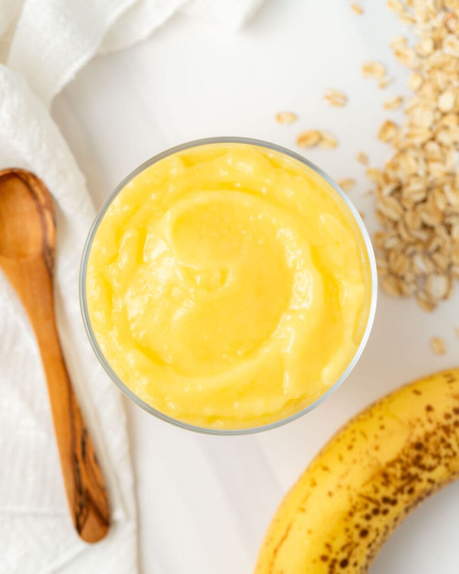Dùng thìa sạch nghiền nhuyễn phần thịt chuối. Có thể trộn thêm một ít sữa mẹ cho loãng và dễ nuốt hơn.