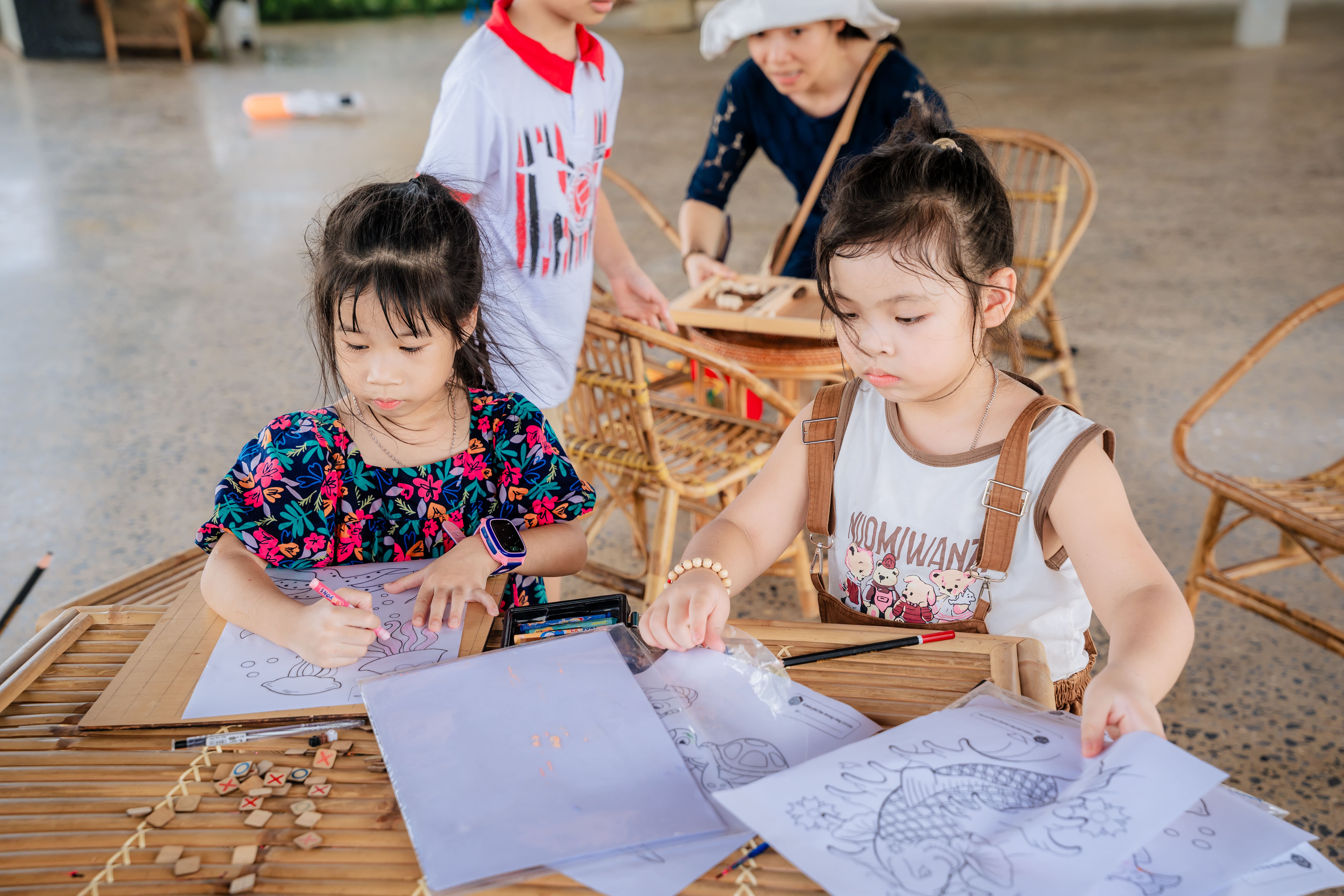 Các mẹ thì tranh thủ chụp lại những khoảnh khắc đáng nhớ: bé cười rạng rỡ bên thùng gỗ, bé nghiêm túc nghe chú thợ giải thích, hay bé hí hoáy vẽ bức tranh đầu đời về biển cả, bé lái thuyền hoặc dùng cuống hoa để tô màu bức tranh. Những bức ảnh ấy sẽ còn theo suốt hành trình lớn lên của con, nhắc nhớ về một ngày đặc biệt bên gia đình.