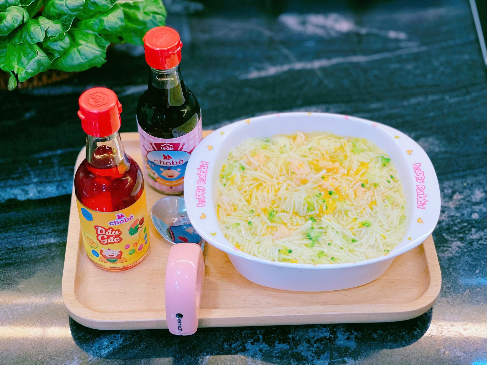 🔸 Cháo tôm rau củ: tôm hấp xay nhuyễn kết hợp với cà rốt/khoai tây/bí đỏ. Nêm sau khi nấu bằng dầu ăn dặm Gấc hoặc Mè Lê Gia, giúp bổ sung vitamin A và chất béo tốt.