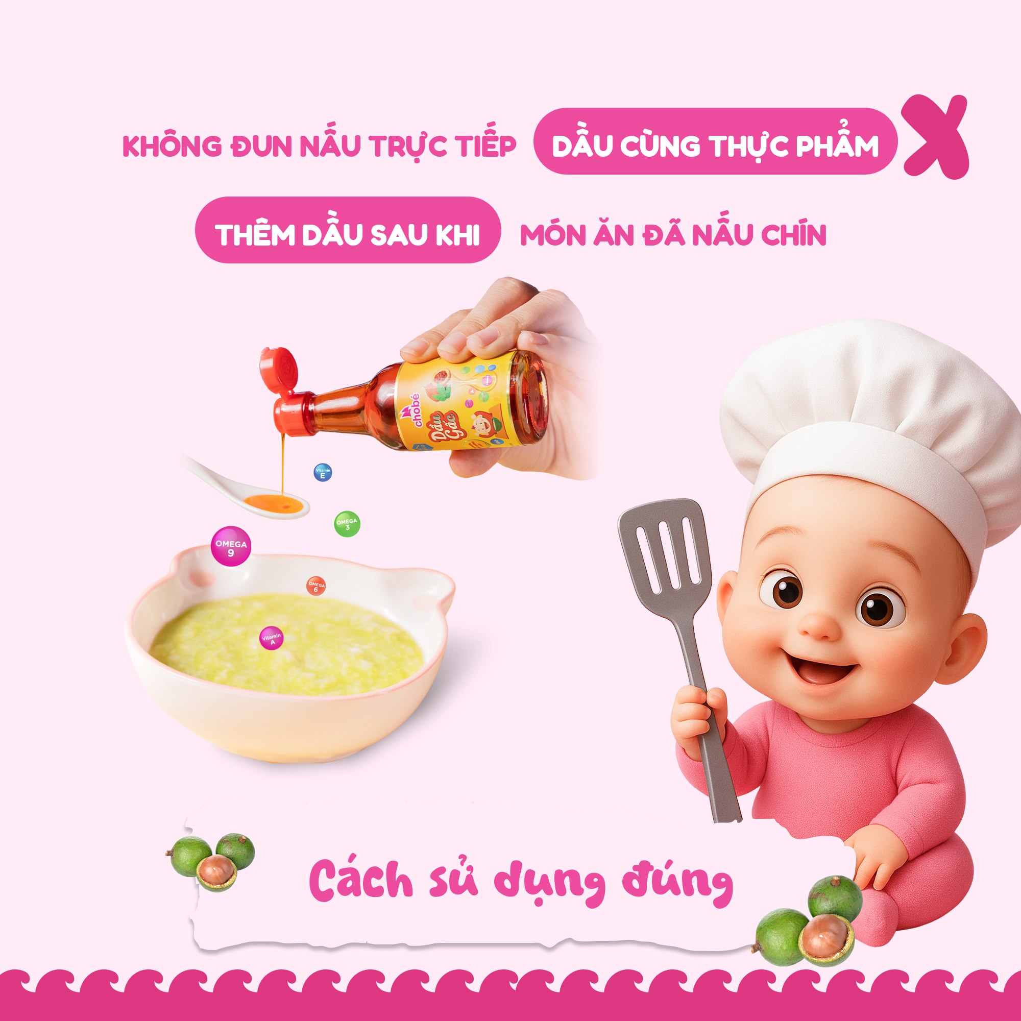 👉 Lưu ý: Ba mẹ không nên cho bé dùng quá nhiều dầu ăn vì có thể gây rối loạn tiêu hóa, khó hấp thu và tăng nguy cơ thừa cân.