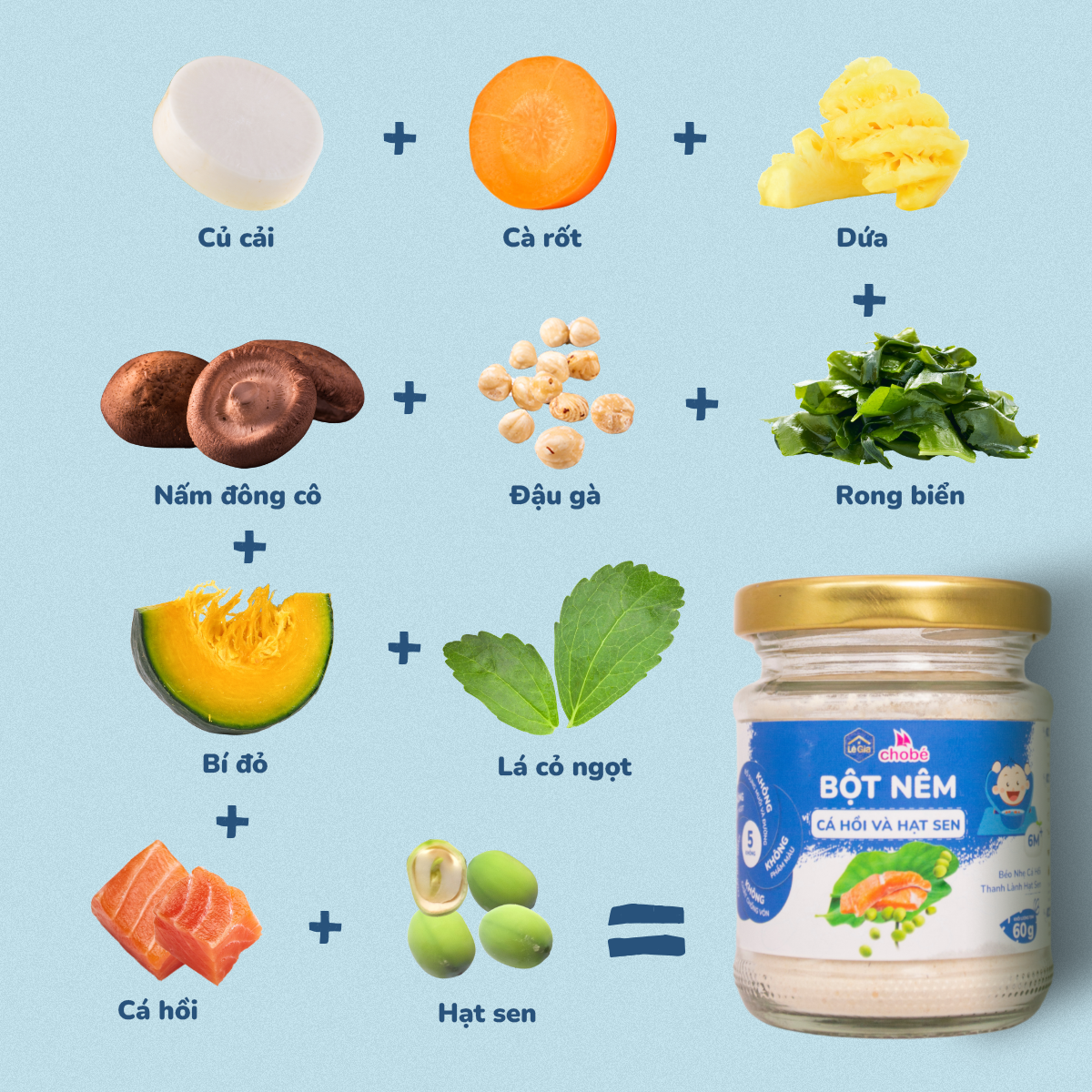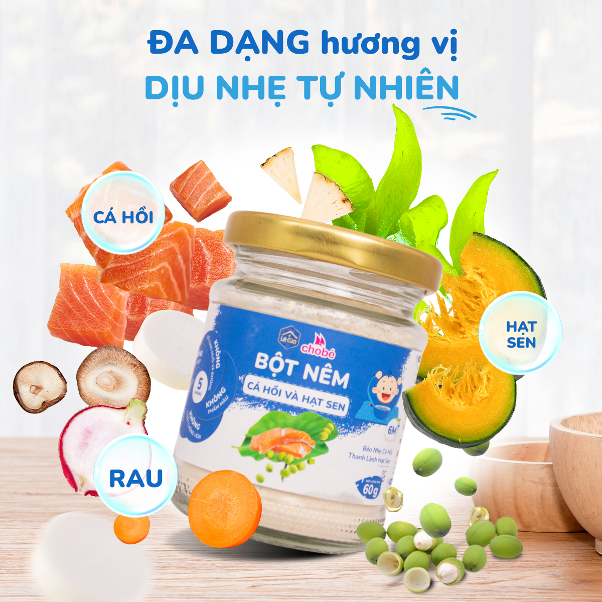 Bữa ăn dặm của bé sẽ thêm thơm ngon và tròn vị với Bột nêm vị cá hồi và hạt sen của Lê Gia. Sản phẩm được kết hợp từ cá hồi giàu protein và hạt sen nhiều dinh dưỡng, mang đến vị ngọt thanh dịu, dễ ăn, phù hợp với khẩu vị của trẻ trong giai đoạn ăn dặm. Nhờ công nghệ sản xuất hiện đại giúp giữ trọn hương vị từ thực phẩm, bột nêm tan nhanh trong cháo, súp hay mì ăn dặm, giúp ba mẹ nêm nếm tiện lợi hơn mỗi ngày. Chỉ một lượng nhỏ là món ăn đã thêm đa dạng hương vị tự nhiên, giúp bé hứng thú hơn với mỗi bữa ăn.