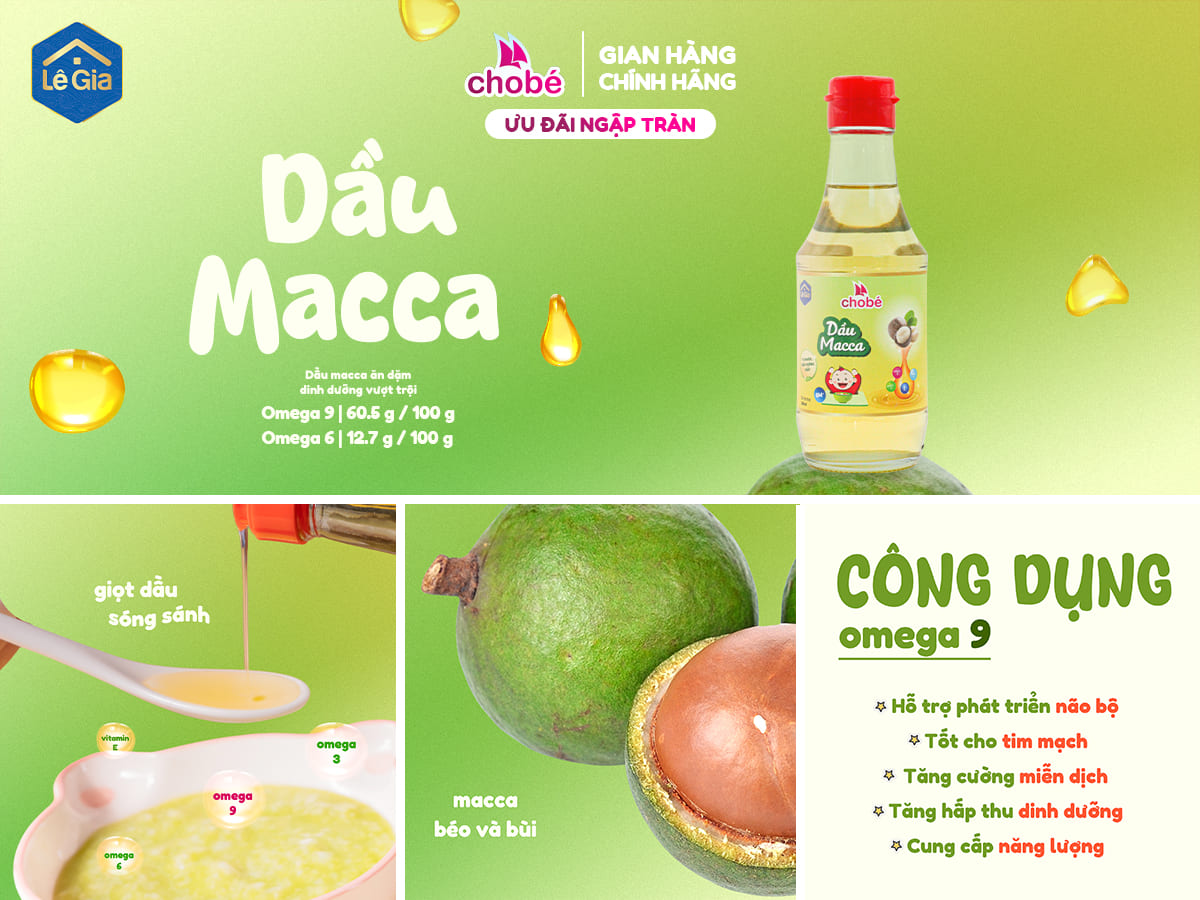 • Dầu Macca là loại dầu thực vật giàu dưỡng chất, rất phù hợp để bổ sung vào khẩu phần ăn dặm của bé. Với hàm lượng cao omega-3, omega-6 và omega-9, dầu Macca hỗ trợ phát triển trí não, tăng cường trí nhớ và khả năng tập trung cho trẻ ngay từ những năm đầu đời.