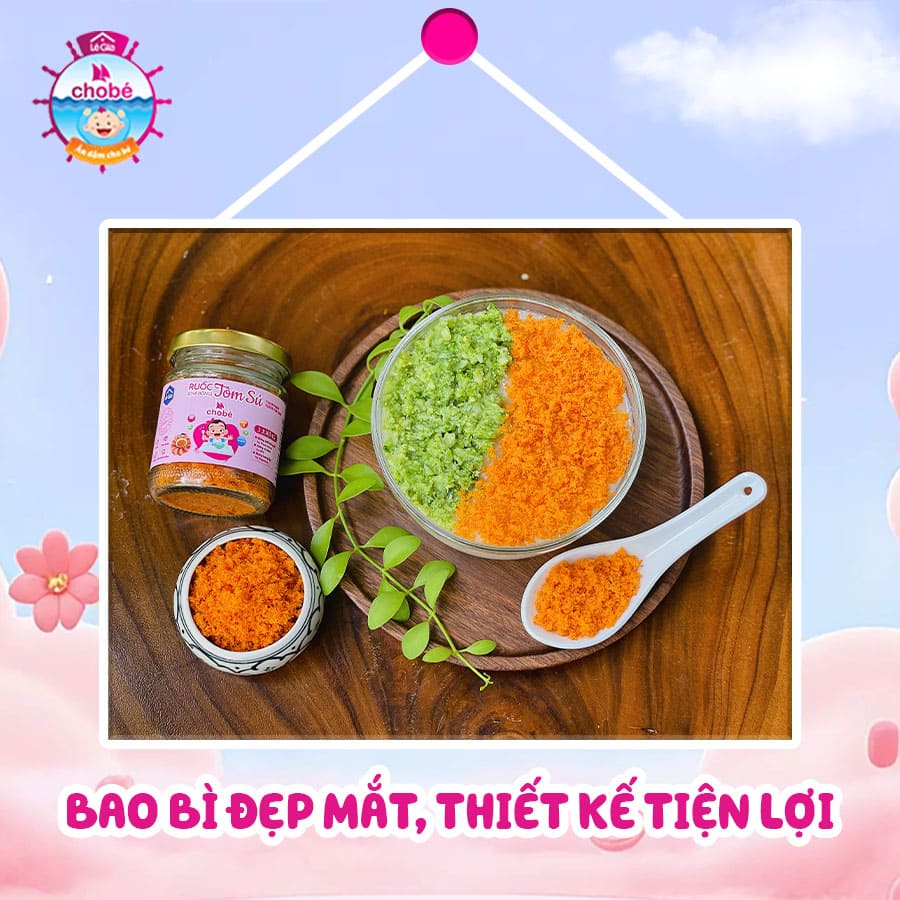 Ruốc tôm sú cho bé có thể ăn trực tiếp với nhiều món như cơm nóng, xôi, bánh mì, bánh cuốn, cháo, hoặc bánh bèo. Đây là một lựa chọn tuyệt vời giúp trẻ có bữa ăn phong phú, ngon miệng và đầy đủ dinh dưỡng.