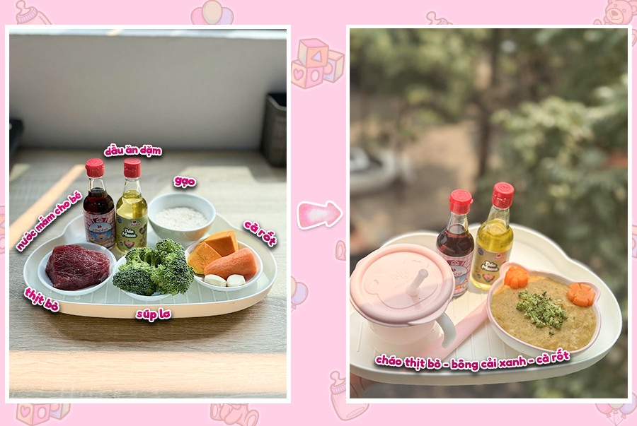 • Ngày 30: Cháo gạo + rau củ tổng hợp + dầu ăn dặm (Mè, Olive, Óc chó…).